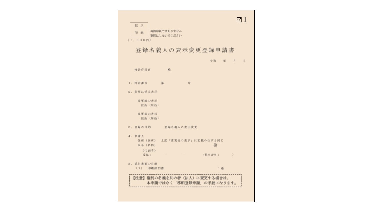 この情報が判明したら、まず原簿の確認をします。原簿とは、特許庁に登録されている権利の情報で、私たちの生活にたとえると、戸籍謄本のようなものです。そしてこの原簿と登録義務者の情報が一致していることが前提です。もし出願後に、権利者の転居、婚姻、商号変更などにより住所や名称が変更していて情報が一致しない場合は、原簿上の権利者の表示を変更する手続(「登録名義人の表示変更登録申請書(図1)」の提出)を済ませてから権利移転手続に着手します。素人考えで、最終的には名義や住所の変更をするのに、わざわざ古い情報に変更登録する必要があるのかと思ってしまいますが、スタート地点をキッチリそろえてから始めなければなりません。