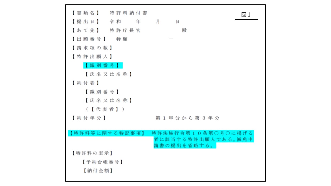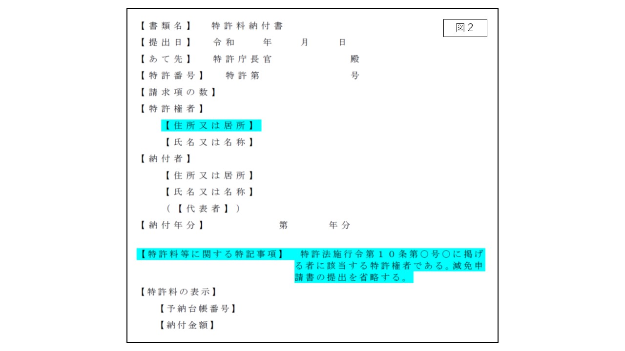 話は戻り、出願人がその減免措置の対象であれば、書面の【特許出願人】欄に【識別番号】(または【住所又は居所】)欄を記載する、さらに【特許料等に関する特記事項】欄を設け「減免を受ける旨」と「減免申請書の提出を省略する旨」を記載して、晴れて特許料を納付することができます。第4年分以降の年金納付も同様です。(図2)