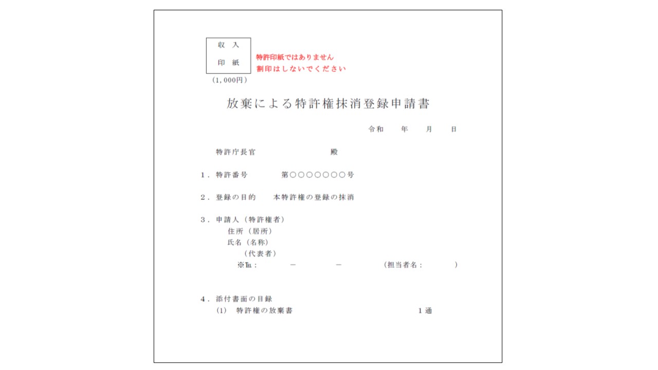 特許権や商標権などの権利を放棄する場合は、「放棄による○○権抹消登録申請書」(下図)を特許庁へ提出します。
