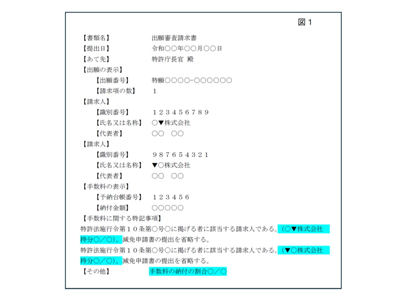 特許出願を複数の出願人と共同で出願。減免措置の対象である出願人が含まれているとき、出願審査請求書の書面が通常と少し違っていました。
